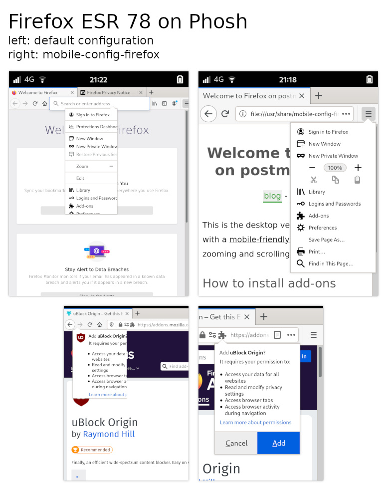 We already have it (package firefox-esr-mobile-config) and it should be installed by default, although we’re currently at version 2.0.0 while postmarketOS is already at 3.0.0.
