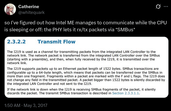 This is why it is important not to connect the integrated LAN controller (even to an RJ45 connector on the board, but in any case not connect an ethernet cable to the RJ45 connector if one exists) and instead use a separate dedicated LAN controller for actual ethernet purposes.