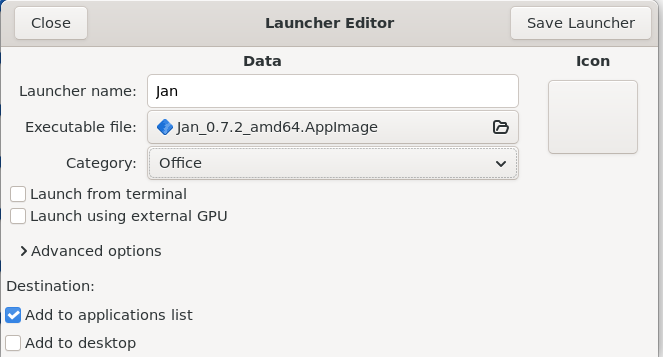 - Fill out the dialogue box as desired, at minimum, check the "Add to applications list” box under the “Destination:” section near the bottom. You might also have to select a category in the drop down menu before the “Save Launcher” button will become active.